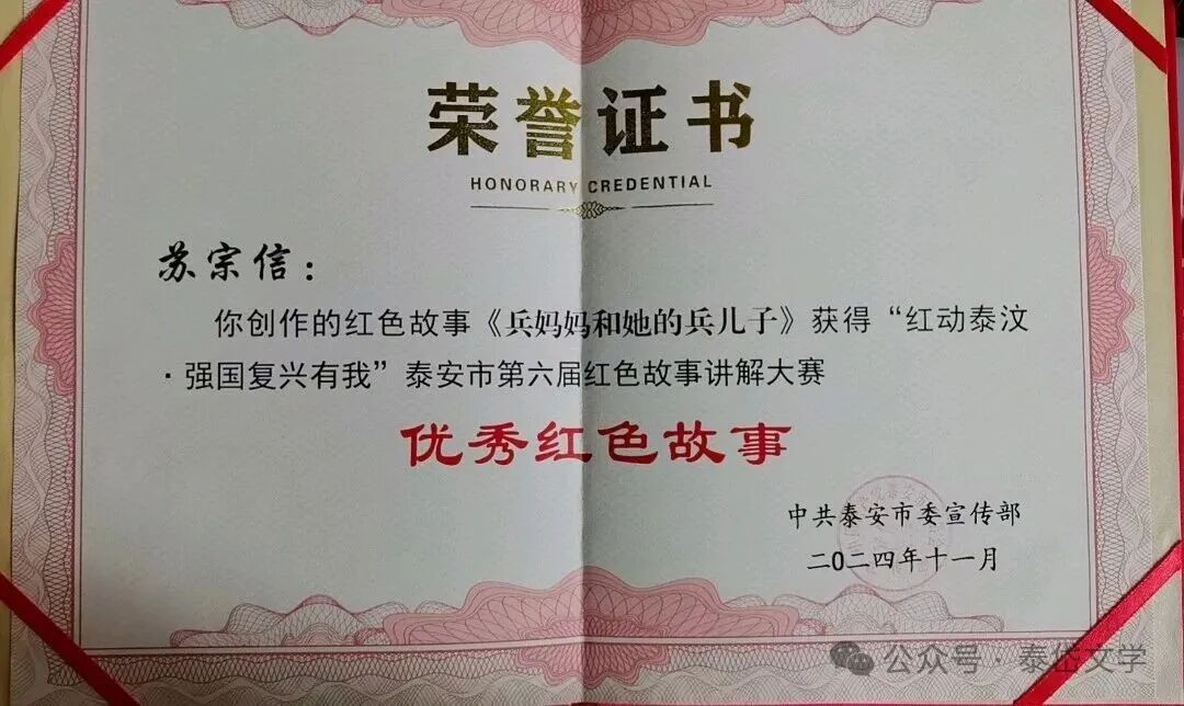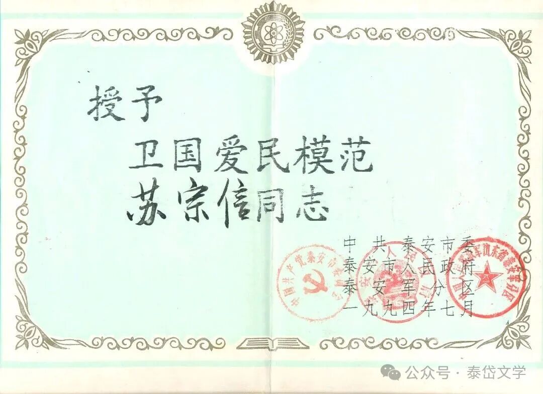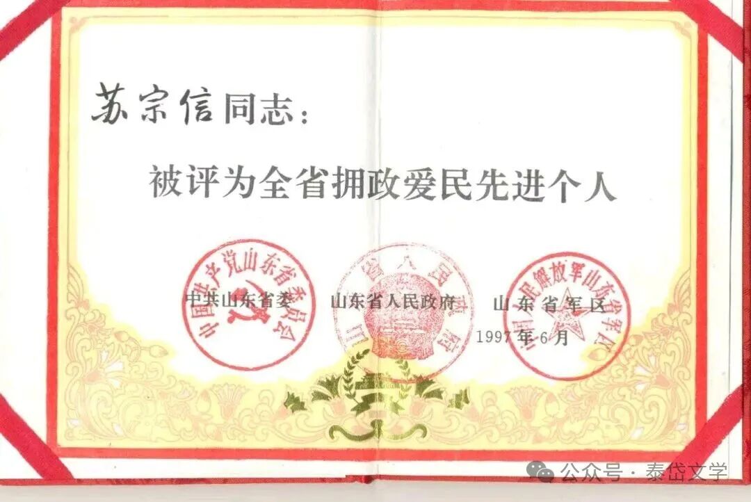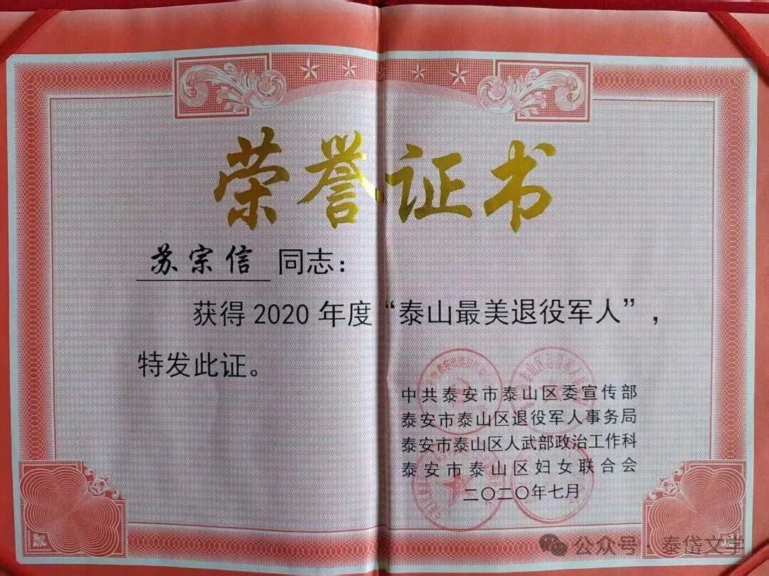 退休后的苏宗信,拒绝“躺平”颐养天年,选择“老有所为”,将全部余热奉献给双拥共建和公益事业,先后获评“泰安市最美志愿者”“泰山最美退役军人”,被家乡南苏村评为“最美关爱家乡人”,用行动践行“退休不退情”的誓言。